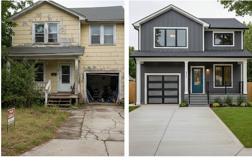 This exterior remodel included new siding, entry upgrades, and curb appeal improvements, transforming an aging façade into a clean, modern exterior that enhances appearance and long-term home value.